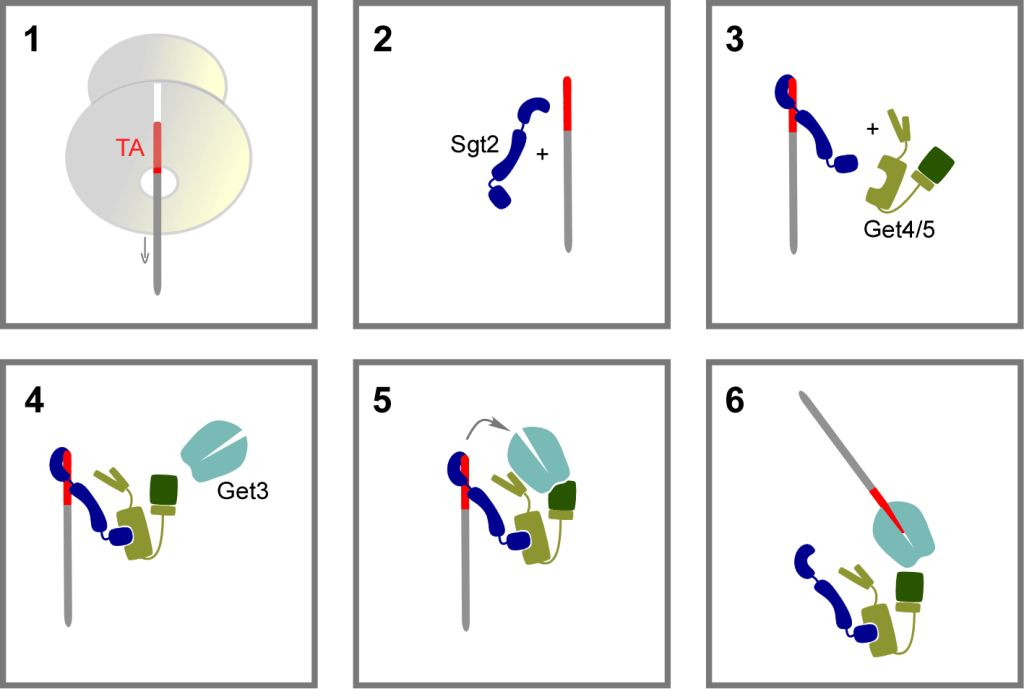 (1) The ribosome synthesizes a TA protein. (2) After ribosome-release the TA protein is captured by the chaperone-like protein Sgt2, which shields the hydrophobic TA sequence and prevents aggregation. (3) The Sgt2/TA protein complex then recruits the Get4/5 complex, which interacts with Sgt2 via Get5. (4) As a next step Get3 binds to Get4 and forms the pre-targeting complex. (5) Within this complex the TA protein is transferred to Get3. (6) Get3 bound to the TA protein dissociates and delivers the TA protein to the insertase in the ER membrane.