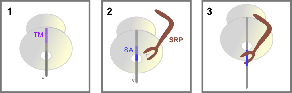 (1) The ribosome synthesizes a polypeptide containing a TM domain. (2) When translation continues, the TM domain emerges from the ribosomal tunnel cotranslationally and serves as a SA sequences. (3) SRP binds to the exposed SA sequence and targets the ribosome nascent chain complex to the SRP receptor in the ER membrane.